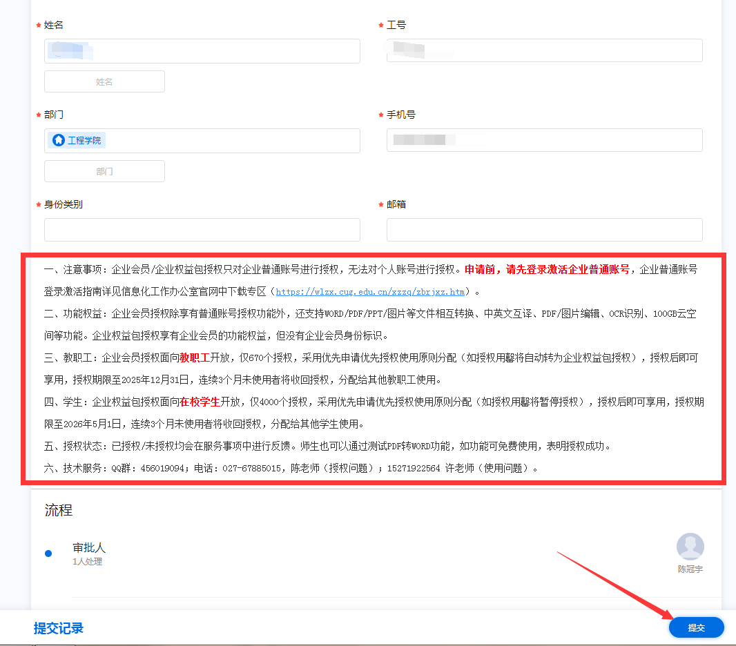 4、将内容填写完成后,点击提交,请重点关注红框内的“注意事项”依照提示完成操作。