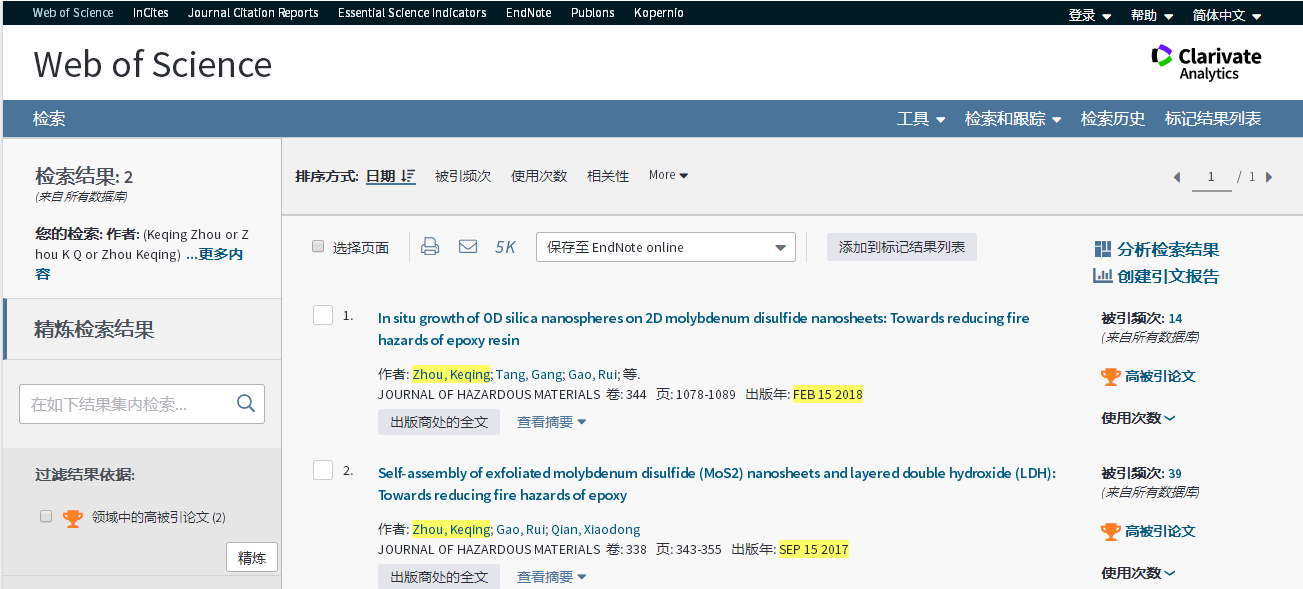 基本科学指标数据库(Essential Science Indicators,简称ESI)最新数据显示,安全工程系周克清老师发表的论文“In situ growth of 0D silica nanospheres on 2D molybdenum disulfide nanosheets: Towards reducing fire hazards of epoxy resin”入选高被引论文。该论文是周克清老师以beat365英国官方网站为第一单位、第一作者和通讯作者身份发表的第2篇ESI高被引论文。2018年7月周克清老师发表的论文“Self-assembly of exfoliated molybdenum disulfide (MoS2) nanosheets and layered double hydroxide (LDH): Towards reducing fire hazards of epoxy”曾同时入选ESI高被引论文和热点论文。