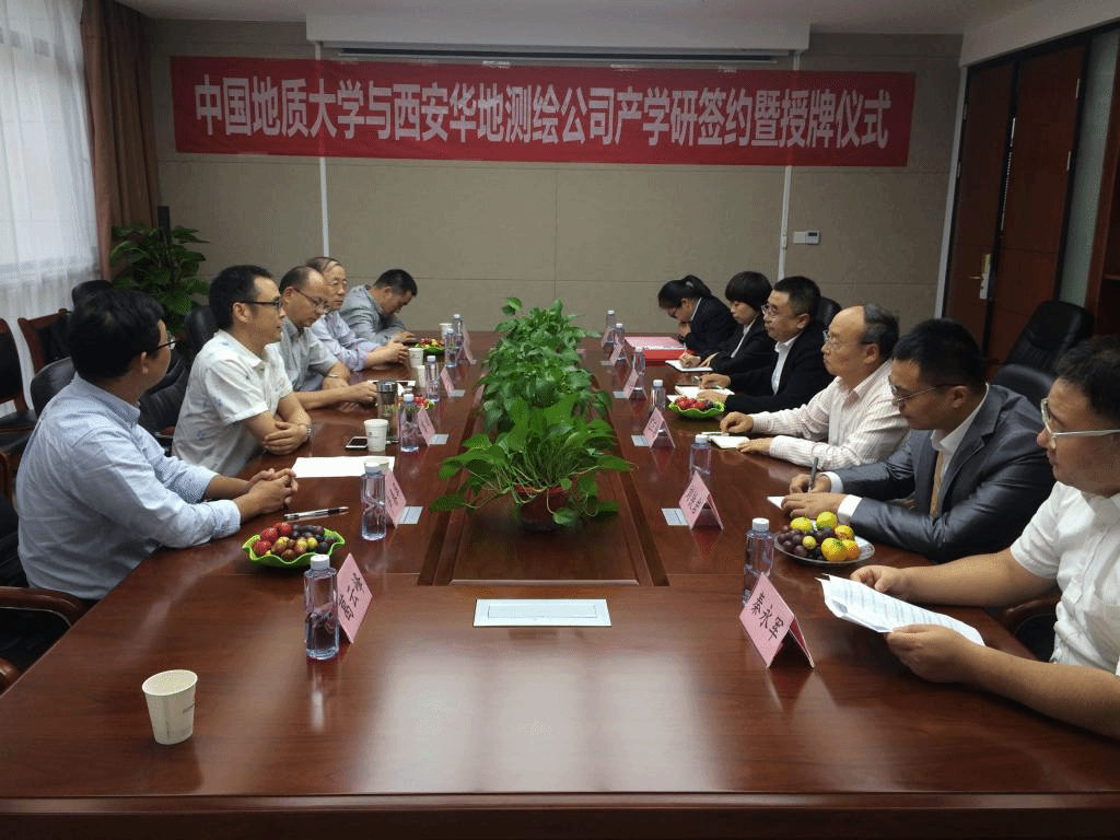 在西安华地测绘科技有限公司,总经理鲁尚强、首席专家亢三焕、营销部经理刘铁岩、财务部经理宋娇艳、人力资源经理秦永军、行政经理任飞霞参与了座谈。座谈会上,总经理鲁尚强代表西安华地测绘科技有限公司致欢迎辞,并介绍了公司的发展概况。窦斌介绍了学校、学院的发展历程,期望双方今后将产学研工作落到实处,预祝取得丰硕成果。beat365英国官方网站(武汉)与会人员,还针对地质灾害评价、地学大数据空间信息获取、地质勘探数据通信传输等领域的技术问题,为公司出谋划策,展开了深入交流。窦斌副院长与鲁尚强总经理分别代表beat365英国官方网站(武汉)与西安华地测绘科技有限公司,在产学研合作协议上签字。根据协议,双方将发挥各自优势,围绕工程地质勘察行业改革发展,实现信息资源共享、优势互补,在人才培养、学科建设及科研成果转化等方面开展合作。会后,江广长副书记与鲁尚强总经理进行了揭牌仪式。