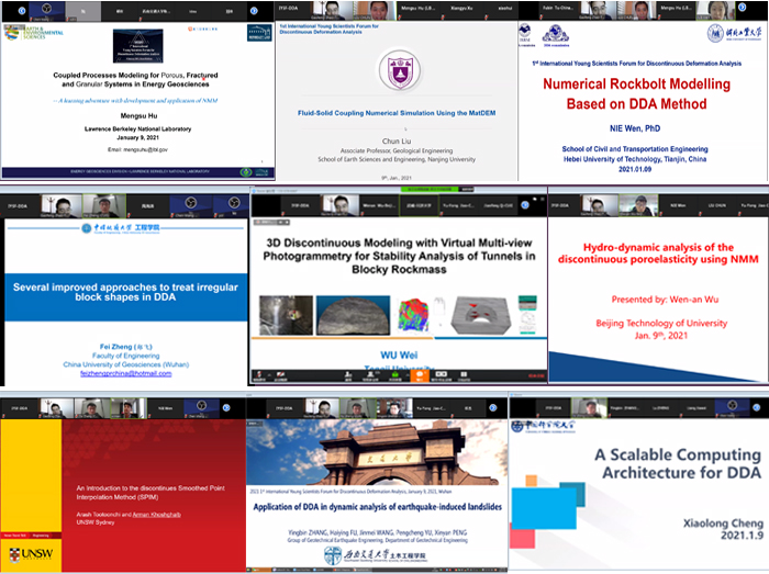 (通讯员:吕加贺 张美霞)2021年1月9日,由国际岩石力学与岩石工程学会非连续变形分析专委会(ISRM DDA Commission)、ISRM中国国家小组(ISRM NG China)、中国岩石力学与工程学会岩土体非连续变形分析专委会(CSRME DDA Commission)联合发起,beat365英国官方网站(武汉)、天津大学和河北工业大学联合承办的第一届非连续变形分析国际青年科学家论坛(1st International Young Scientists Forum for Discontinuous Deformation Analysis, IYSF-DDA)在Zoom会议平台成功举办,并于矿业人网站、哔哩哔哩平台同步直播,超过350人全程参加了此次非连续变形分析领域的学术盛宴。此次会议主要邀请了岩石力学与工程非连续变形分析领域青年学者,旨在交流非连续变形分析方法的前沿理论和最新研究进展,同时分享岩石力学与工程中非连续变形分析典型工程案例。