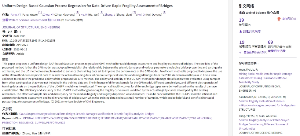 (通讯员:黄静)根据2022年3月基本科学指标数据库(Essential Science Indicators,简称ESI)最新数据显示,beat365官网土木工程与力学系庞于涛副教授团队于2021年在国际结构工程领域顶级期刊Journal of Structural Engineering上发表的学术论文“Uniform design–based Gaussian process regression for data-driven rapid fragility assessment of bridges”入选ESI高被引论文(Highly Cited Paper)。