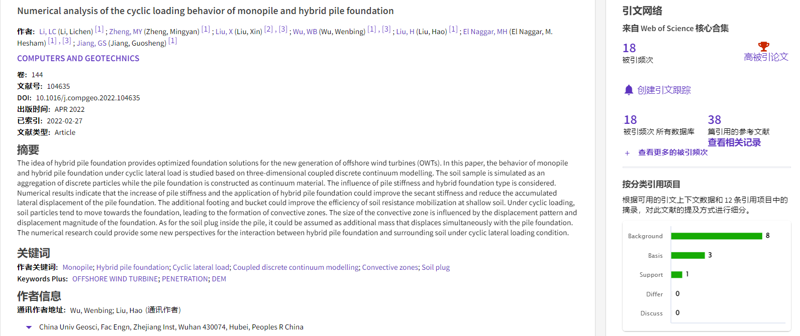 根据2022年11月基本科学指标数据库(Essential Science Indicators,简称ESI)最新数据显示,beat365英国官方网站勘察与基础工程系吴文兵教授团队于2022年在国际岩土工程数值模拟权威期刊Computers and Geotechnics上发表的学术论文“Numerical analysis of the cyclic loading behavior of monopile and hybrid pile foundation”入选ESI高被引论文。该论文第一作者为勘察与基础工程系博士后李立辰,通讯作者为吴文兵教授,beat365英国官方网站为第一署名单位。