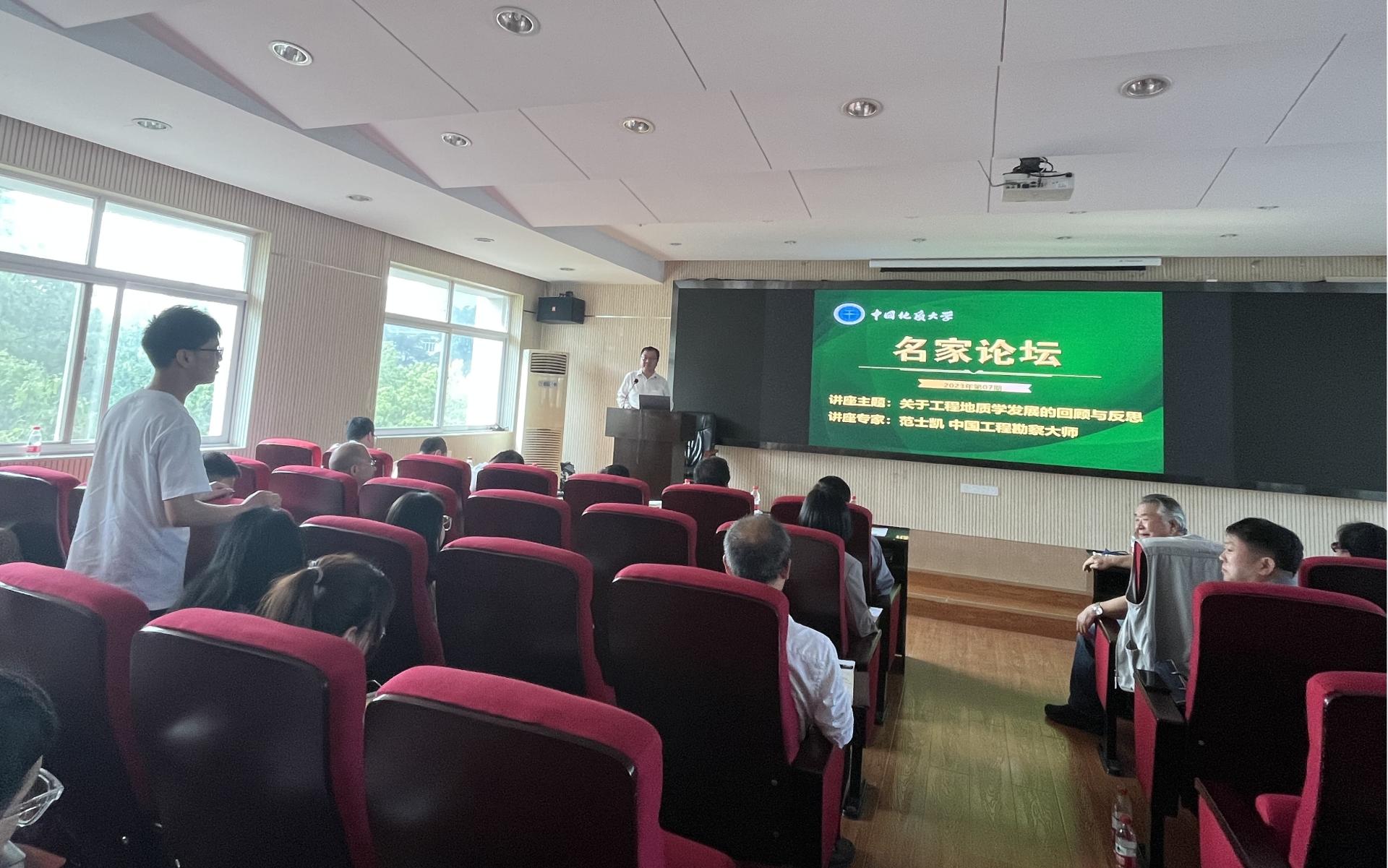 在交流互动环节,师生踊跃提问,范士凯勘察大师作了详细解答。他勉励师生要重视实践教学,扎实做好基础研究工作。唐辉明教授为范士凯勘察大师颁发名家论坛纪念海报。王亮清副院长作了会议总结。