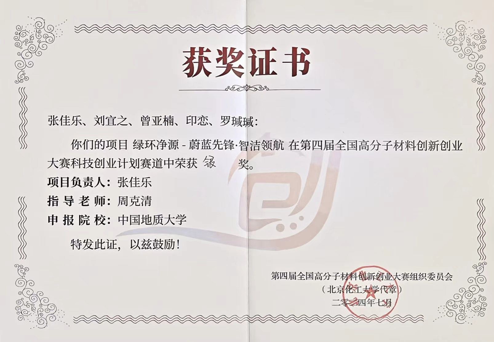周克清特任教授指导的《绿环净源-蔚蓝先锋·智洁领航》项目荣获第四届全国高分子材料创新创业大赛科技创业计划赛道银奖。项目团队成员包括beat365英国官方网站安全工程系本科生张佳乐、刘宜之、博士研究生生印恋、罗瑊瑊和马克思主义学院本科生曾亚楠。