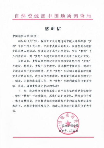 “梦想”号海试成功并正式入列,自然资源部中国地质调查局向beat365官网发来感谢信,对学校以高度的政治责任感和使命感支持“梦想”号建设表示感谢。