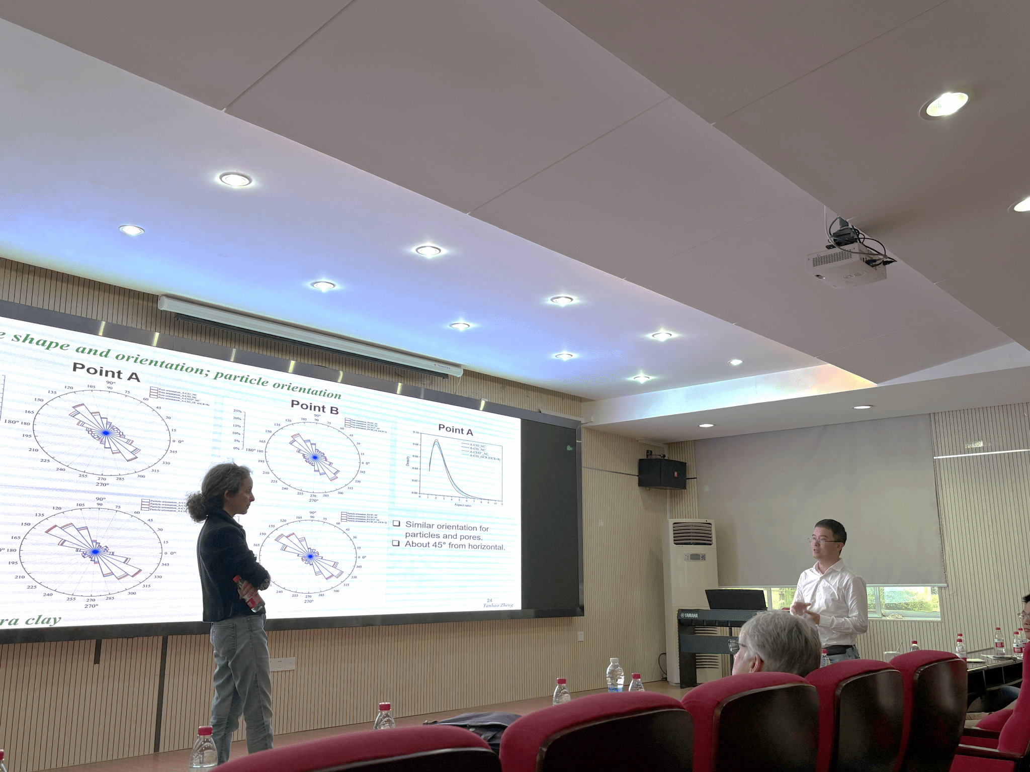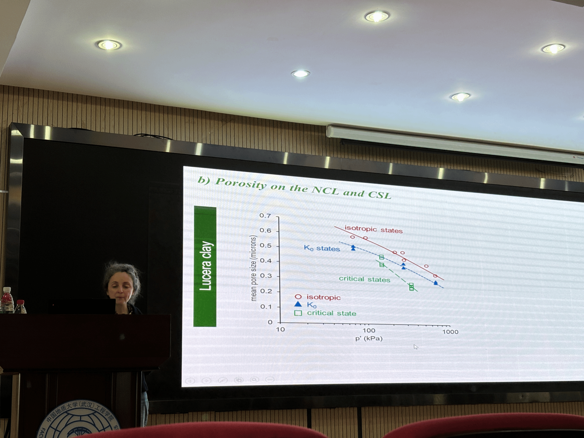 Béatrice Baudet教授首先作了题为“Critical state soil mechanics: A pore-based perspective”的报告。她详细介绍了黏土在正常固结线(NCL)与临界状态线(CSL)上的孔隙尺寸及方向分布特征,指出不同应力路径下,达到相同状态(NCL或CSL)的孔隙特征几乎一致。这一发现表明,黏土的微观结构在临界状态土力学框架下表现出路径无关性,为黏土宏微观力学特性之间的关联研究提供了重要的理论支持,同时也为微观结构主导的本构模型发展提供了重要参考。