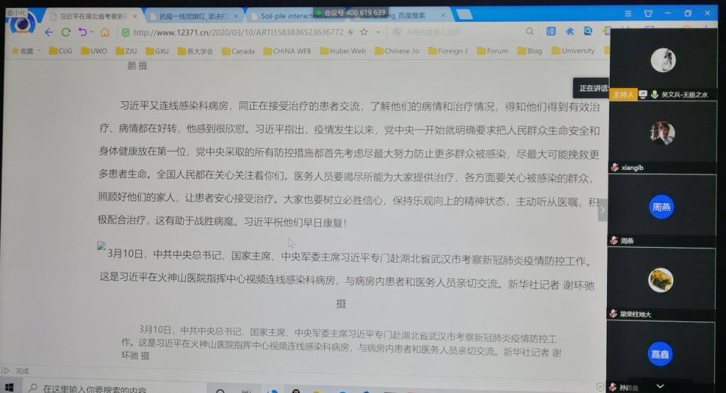 最后,各支部就外地返汉人员情况进行了解,近期工作情况进行交流,纷纷表示,作为党员要起模范带头作用,克服困难,心无旁骛把每一项工作落实落细,为学院未来的人才培养,教学和科学研究献计献策。真可谓: